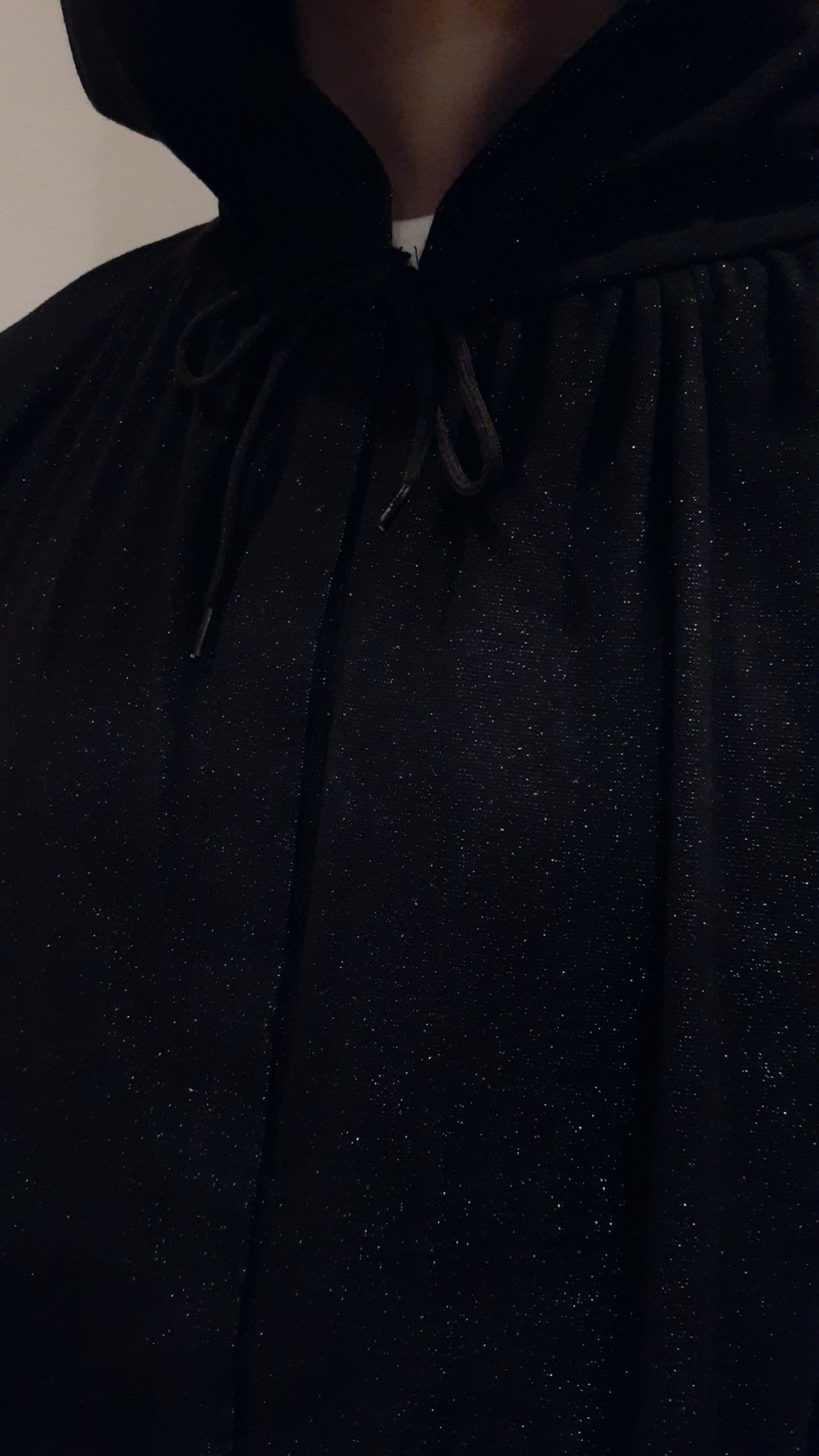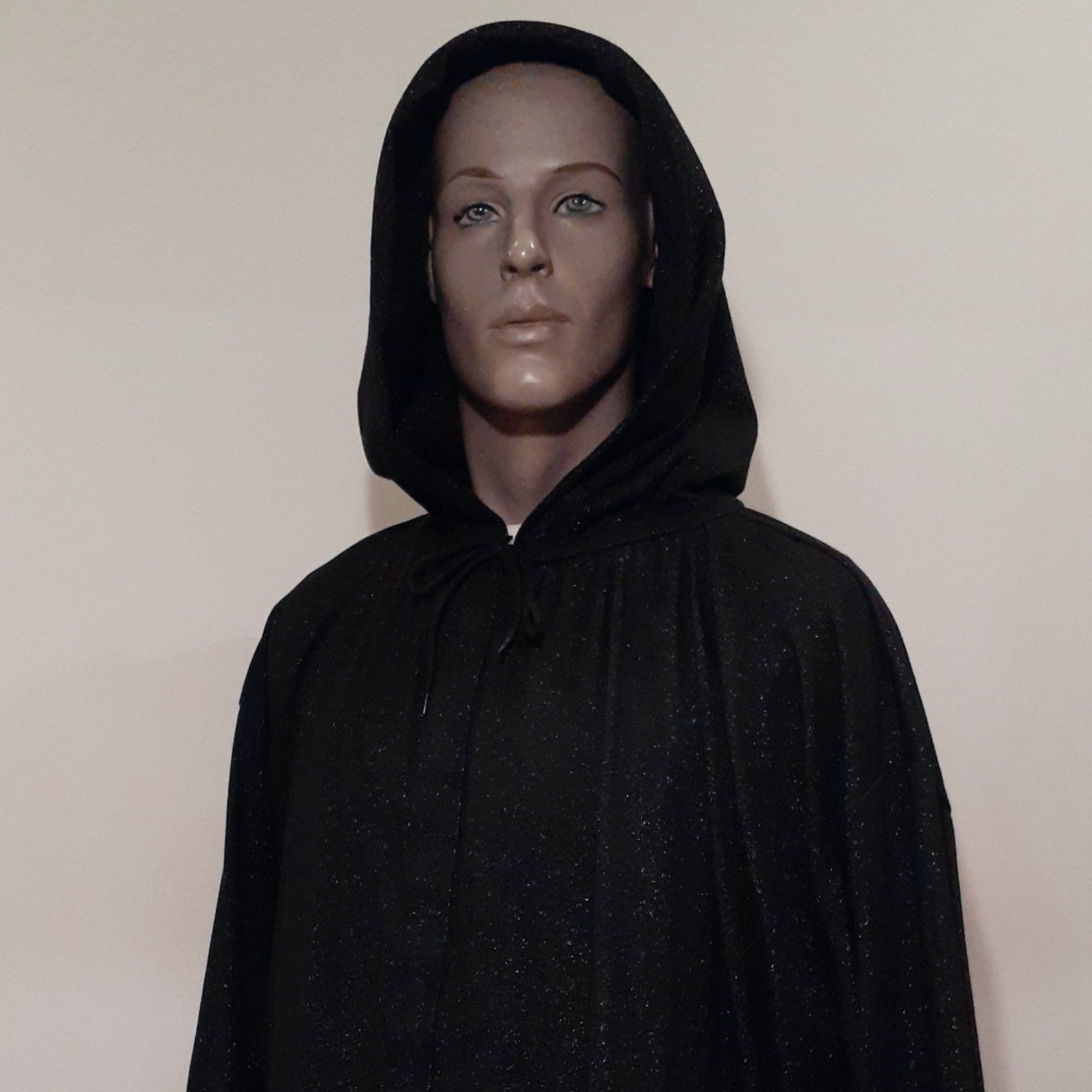 The Sparkle Robes are hand-made with custom-made sparkle fabric. There is a velcro piece inside the hood to attach a mask if it is desired.